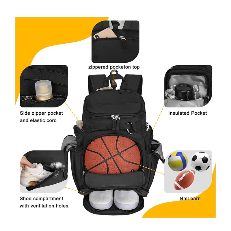 Target team sports and fitness enthusiasts with this ultimate custom basketball bags. Designed with a Large Storage Capacity of 32 liters (11x 20x 9 inches), it can handle a full load of gear. The organization system is perfect for athletes: a dedicated front Ball Compartment securely holds a basketball or soccer ball, while the lower, Vented Shoe Compartment keeps dirty footwear separate, ensuring the main bag stays clean and ventilated. A crucial feature for all-day use is the insulated compartment located on the side, keeping drinks cool and food fresh for hours. Constructed from high-quality Durable Polyester Fabric, the pack is built to withstand rain, dirt, and dust, complemented by sturdy and smooth zippers. The shoe compartment lining is also designed to be easy to pull out for cleaning, adding to the pack's excellent practicality and longevity.