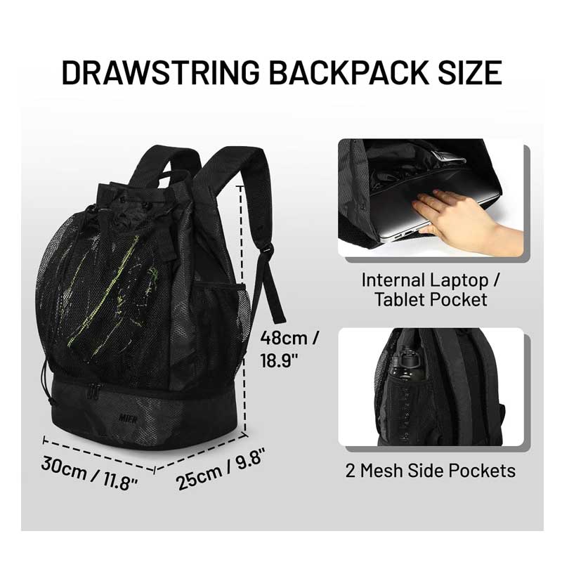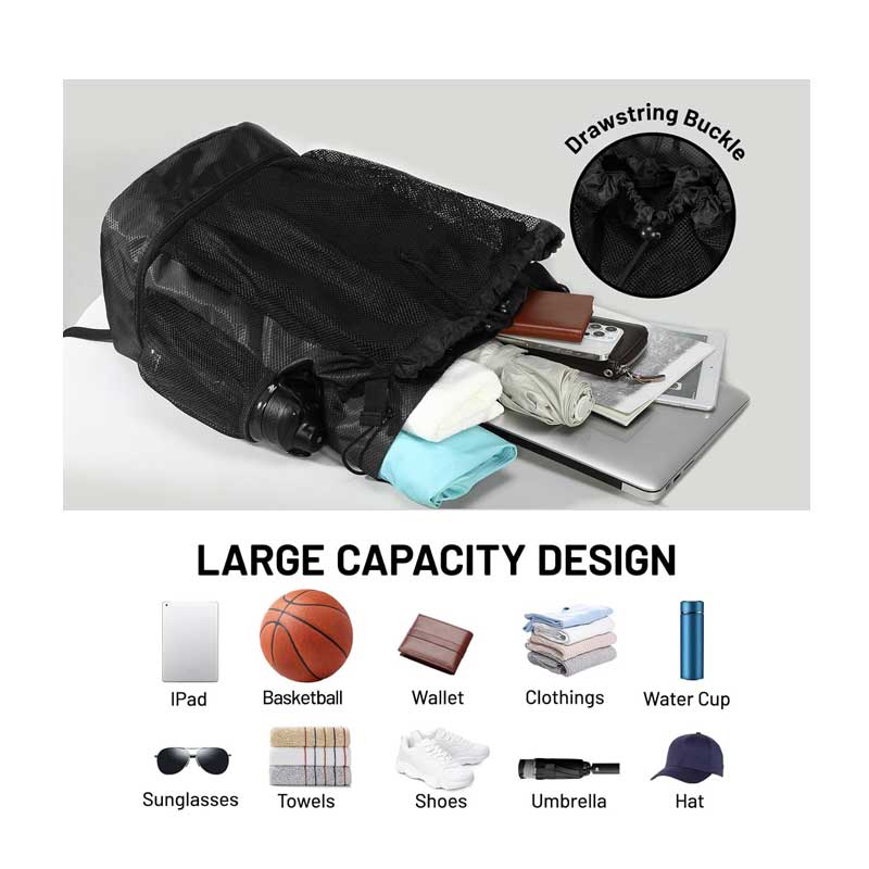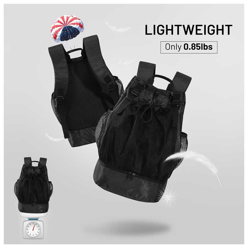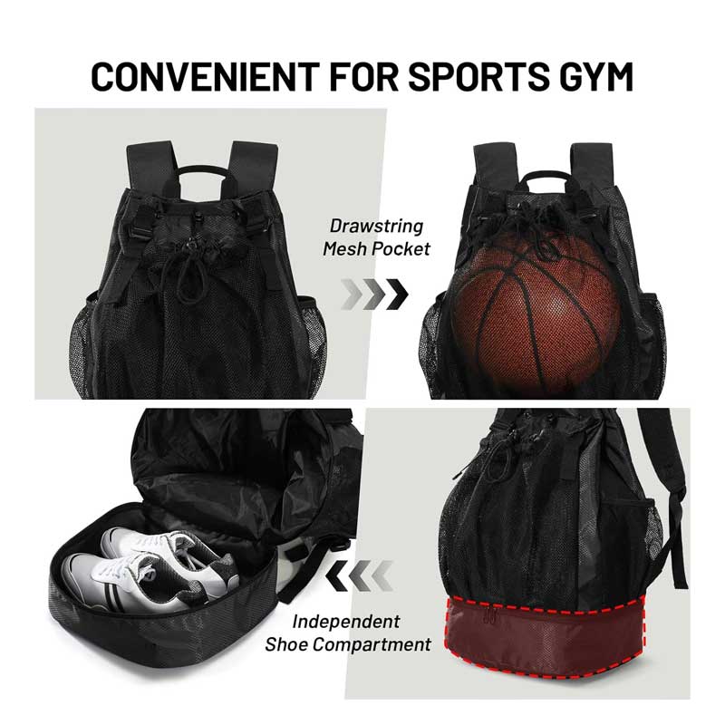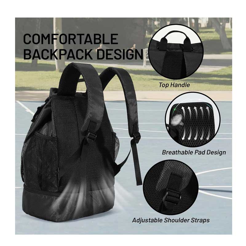 Dual Sports Storage: Features a practical mesh pocket designed to fit balls (basketball, soccer, volleyball) and a separated bottom shoe compartment to store dirty footwear or laundry.