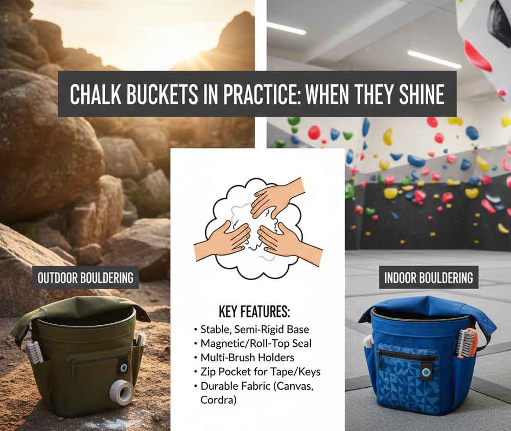 • For outdoor sport and trad, pick a wearable chalk bag for one‑hand, mid‑route chalking; for indoor/outdoor bouldering, choose a freestanding chalk bucket with stable, two‑hand access.