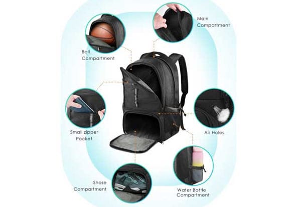 Optional add-ons include roll-top closure, hydration system, organizer pockets, and compression straps.