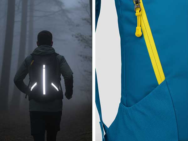 Integrated 3M or high-luminosity reflective strips on the body and webbing for enhanced safety in low-light conditions.