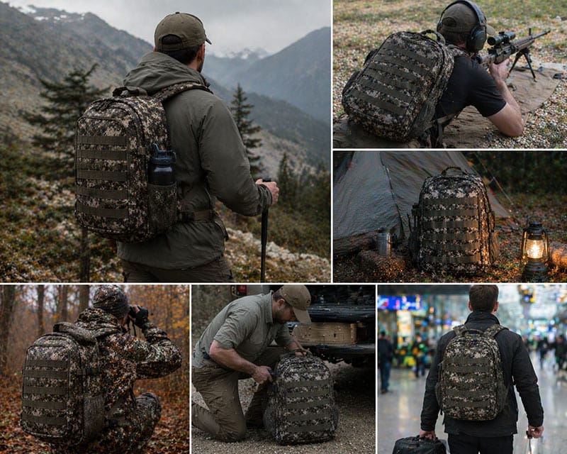 Camo patterns, earth-tone colors, matte accessories, and subtle logo placement help hunting bags fit outdoor retail collections. This makes the product visually different from a general tactical backpack or urban tactical bag.