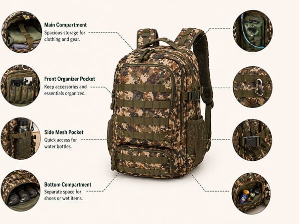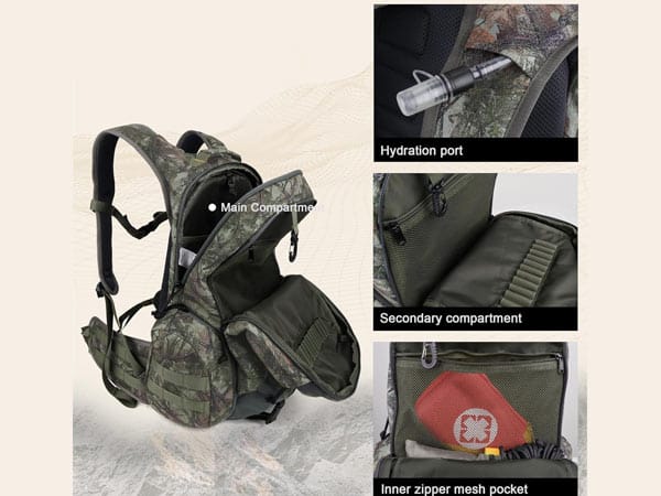 We can customize front pockets, side pockets, internal dividers, compression straps, hydration compartments, MOLLE-style attachment areas, gear loops, and quick-access sections. This makes the product more suitable for hunting-specific gear organization.