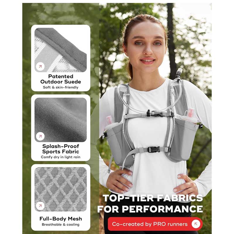 Hydration Ready System: Features a separate compartment compatible with a 1.5L water bladder, plus 2 front pockets for soft bottles, ensuring easy access to fluids while running.