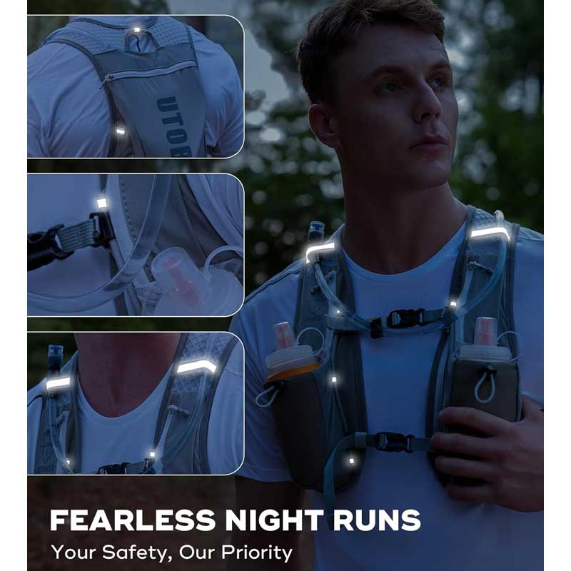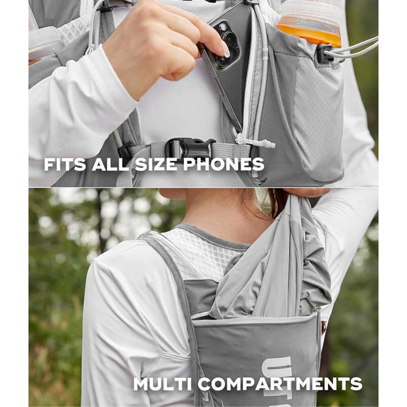 Optimal Storage & Safety: Total 5L capacity with 7 pockets, including a dedicated phone pocket and reflective stripes on both front and back for enhanced visibility in the dark.