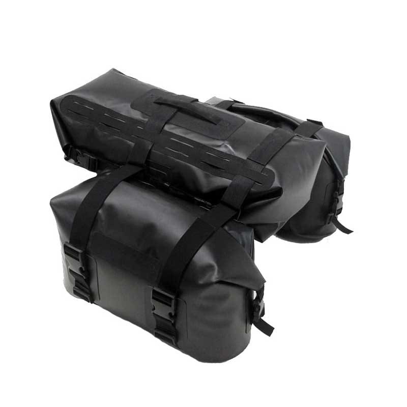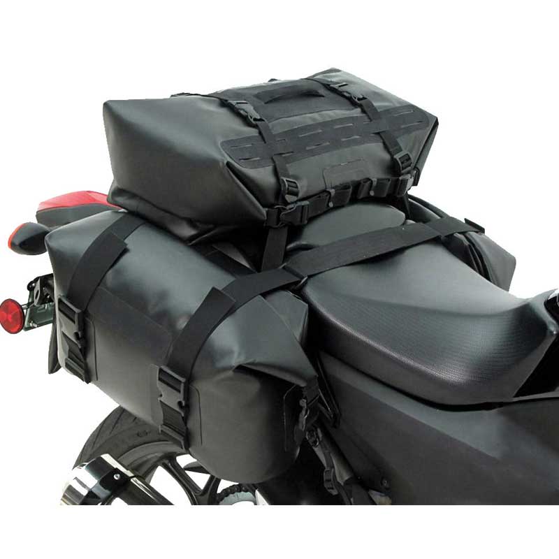 Offer your customers a revolutionary motorcycle luggage solution – our high-performance modular waterproof motorcycle bag system. Designed for riders needing ample storage without the burden of traditional bulky sideracks, it’s perfectly suited for smaller enduro bikes. This comprehensive system includes a full saddlebag set and a large dry bag, providing a generous 68 liters of capacity (22" L x 21" W x 12" H) to meet all adventure touring demands.
