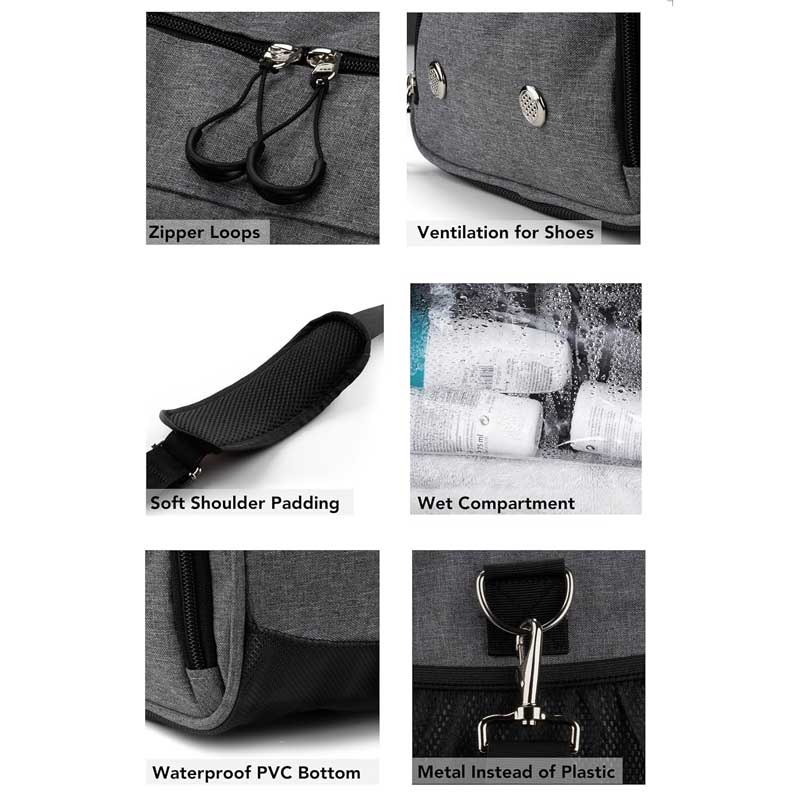 Introduce a modern, highly functional gym duffel bag designed for the active consumer. This versatile duffel seamlessly blends sporty aesthetics with elegant design, making it excellent for various uses: from a dedicated training bag and swimming bag to a weekend travel companion (size S is suitable as airplane carry-on luggage). A key selling point is the clever organization: it includes a dedicated, ventilated shoe compartment and a waterproof wet compartment for storing bath supplies or sweaty clothes, keeping everything neatly separated. Functionality is paramount, featuring a strong outer fabric and a waterproof bottom for optimal content protection. We use high quality brand zippers throughout, enhanced by practical zip loops for convenient operation. With 5 separate compartments, organizing gear is simple. Partner with our wholesale gym bag for bulk orders, customization of colors (like the grey shown, plus black, purple, blue options) and material specifications to match your brand’s quality promise.