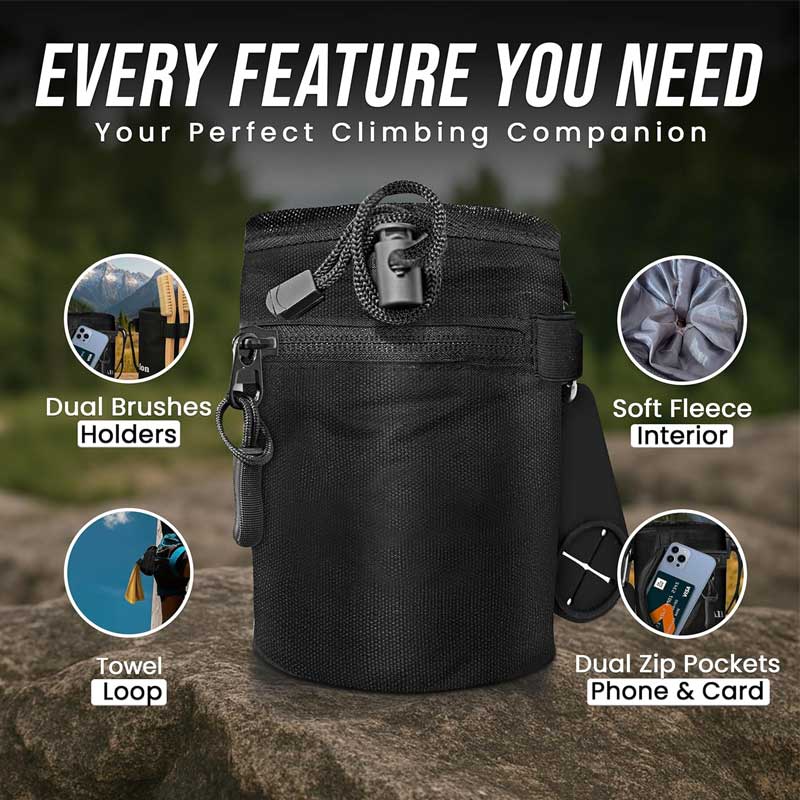 • Climber-Focused Convenience: Includes dual brush holders (for left/right-handed users) and a towel loop, plus a bonus carabiner for versatile attachment options.