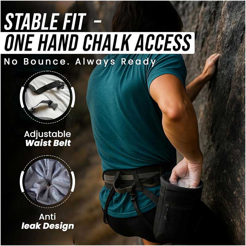 • No-Spill Drawstring System: Features an upgraded drawstring closure that creates a tight seal when not in use, effectively preventing chalk from leaking out.