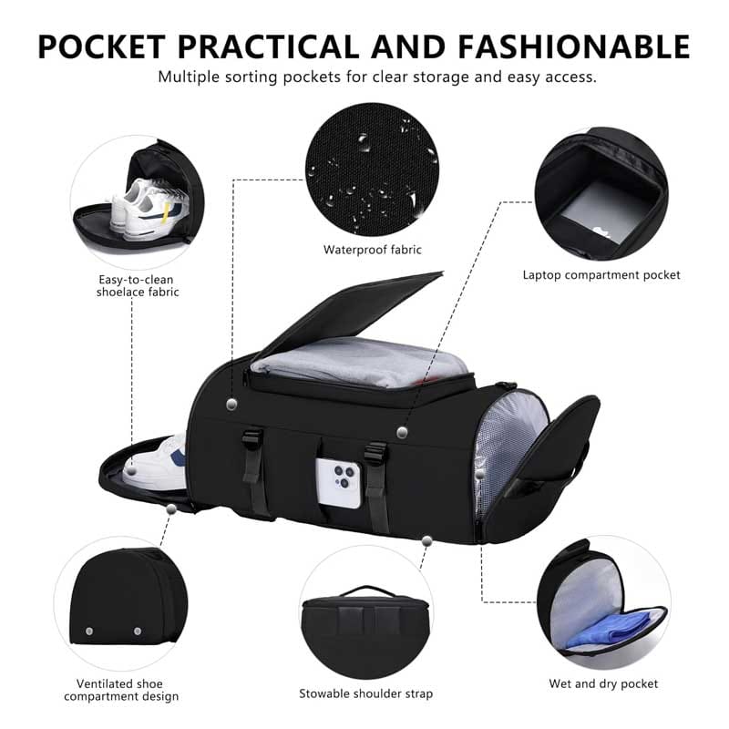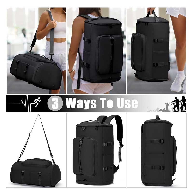 Provide your customers with the ultimate functional and durable gym solution. This innovative sport duffel bag with shoe compartment elevates convenience with its 3-way carrying options: easily convert it from a modern backpack to a crossbody duffel or a simple handbag by hiding the straps. Constructed from a new upgraded canvas material, the bag offers superior tear resistance, is waterproof, and maintains an anti-wrinkle finish, even after long storage. The hygienic design is a major selling point: the dry and wet separation pocket is lined with waterproof PVC, perfect for sweaty gear or boxing gloves, while the side separate shoe compartment keeps shoes quarantined. The spacious main area is highly organized, featuring a computer pocket suitable for tablets/laptops and an external pocket for a water bottle. As a wholesale gym bag supplier, we specialize in customizing this versatile bag in bulk, ensuring the quality of the canvas and the reliability of the zipper systems for heavy-duty workout use.
